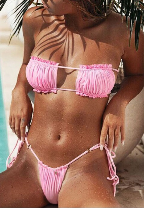 Splash in the ocean in this bikini featuring a strapless bandeau style, a ruffled trim, a tie back closure, and matching bottoms with side tie closures and a thong cut back.