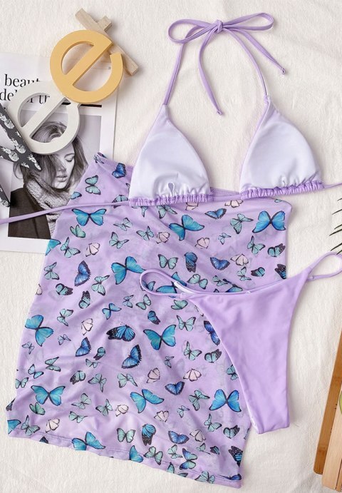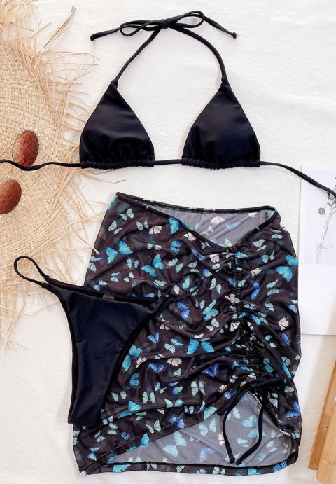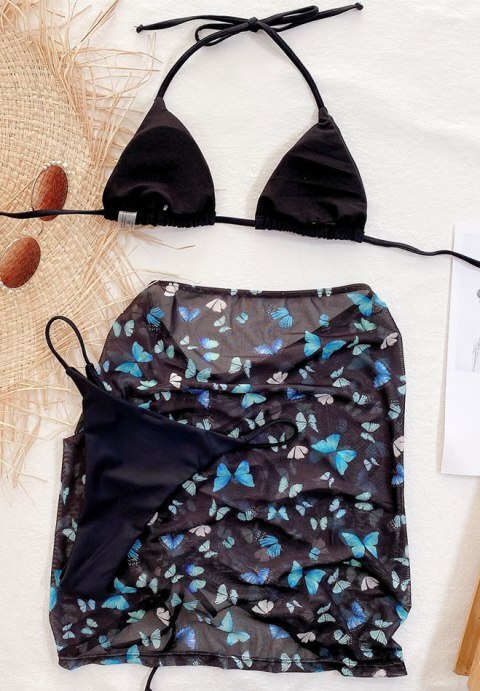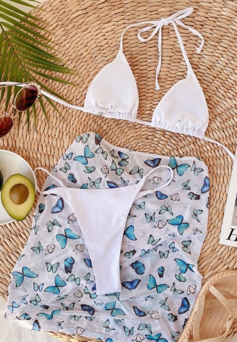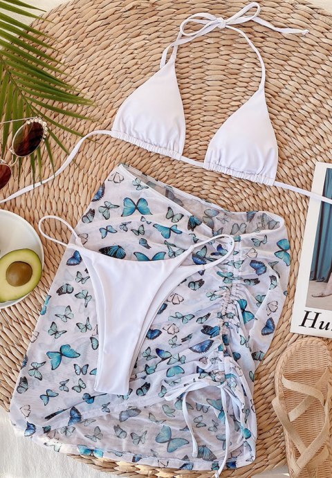 Anchors away! Be your babe's hottest catch in this stunning 3-piece swimsuit featuring string triangle cups, halter straps, a string tie back closure, a matching bottom with thin hip straps, a cheeky cut back., and a sheer mesh high waist skirt.