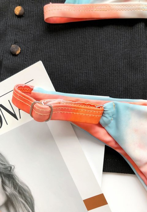 Bring vibrant color to your swimwear with this sexy swimsuit set featuring triangle cups with an all over colorful tie dye print, adjustable spaghetti straps, a hook back closure, and a matching bikini bottom with straps sides, and a cheeky cut back.