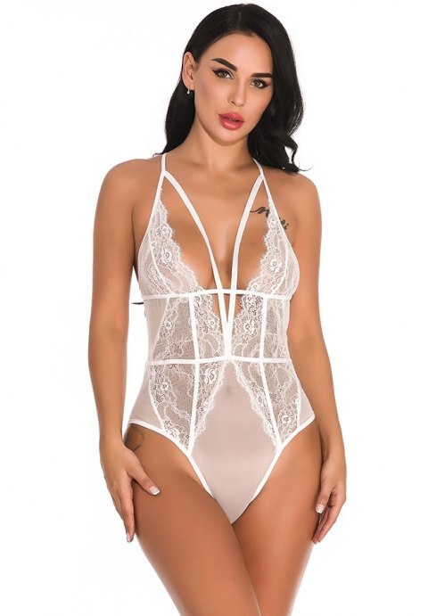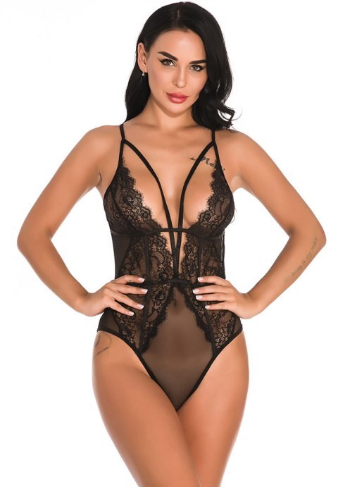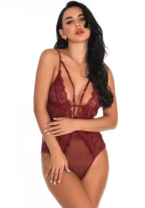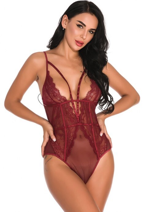 Flatter every inch of your figure in this sexy teddy featuring sheer lace cups, a plunging V-neckline with strappy bust detailing, adjustable spaghetti straps, and a cheeky cut back.