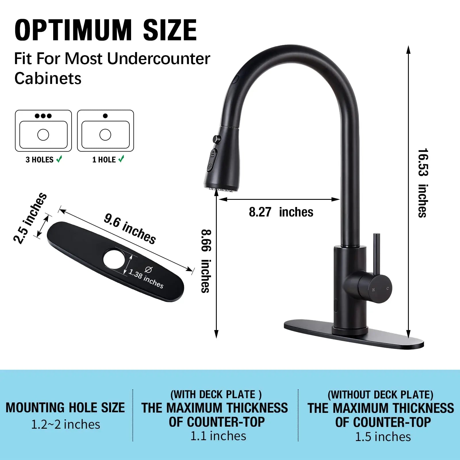 Elevate your kitchen with this modern touch-sensitive kitchen faucet, designed for both style and function. The matte black finish, pull-out sprayer, and single-handle design provide a sleek, minimalist aesthetic while delivering precision and convenience in your daily kitchen routine.