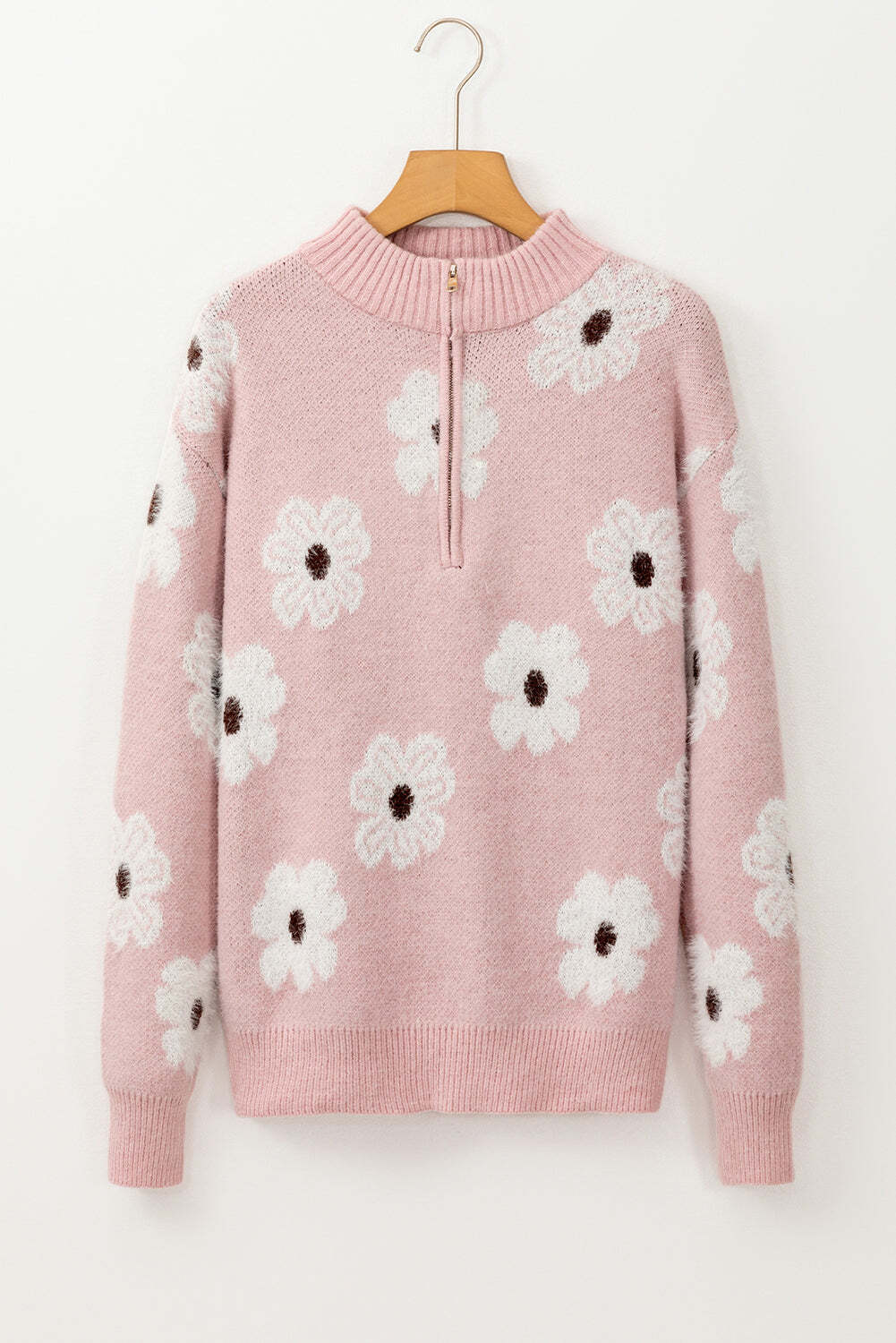 Pink Floral Pattern Half Zip Drop Shoulder Sweater