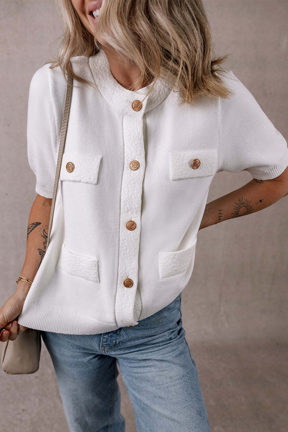 White Gold Buttons Textured Sweater T Shirt