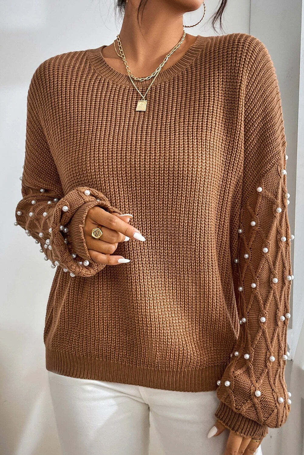 Chestnut Beaded Drop Shoulder Round Neck Sweater