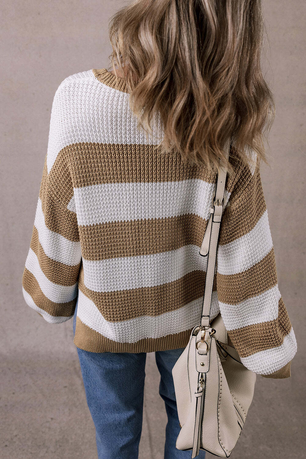 Light French Beige Colorblock Striped Drop Shoulder Side Slit Sweater