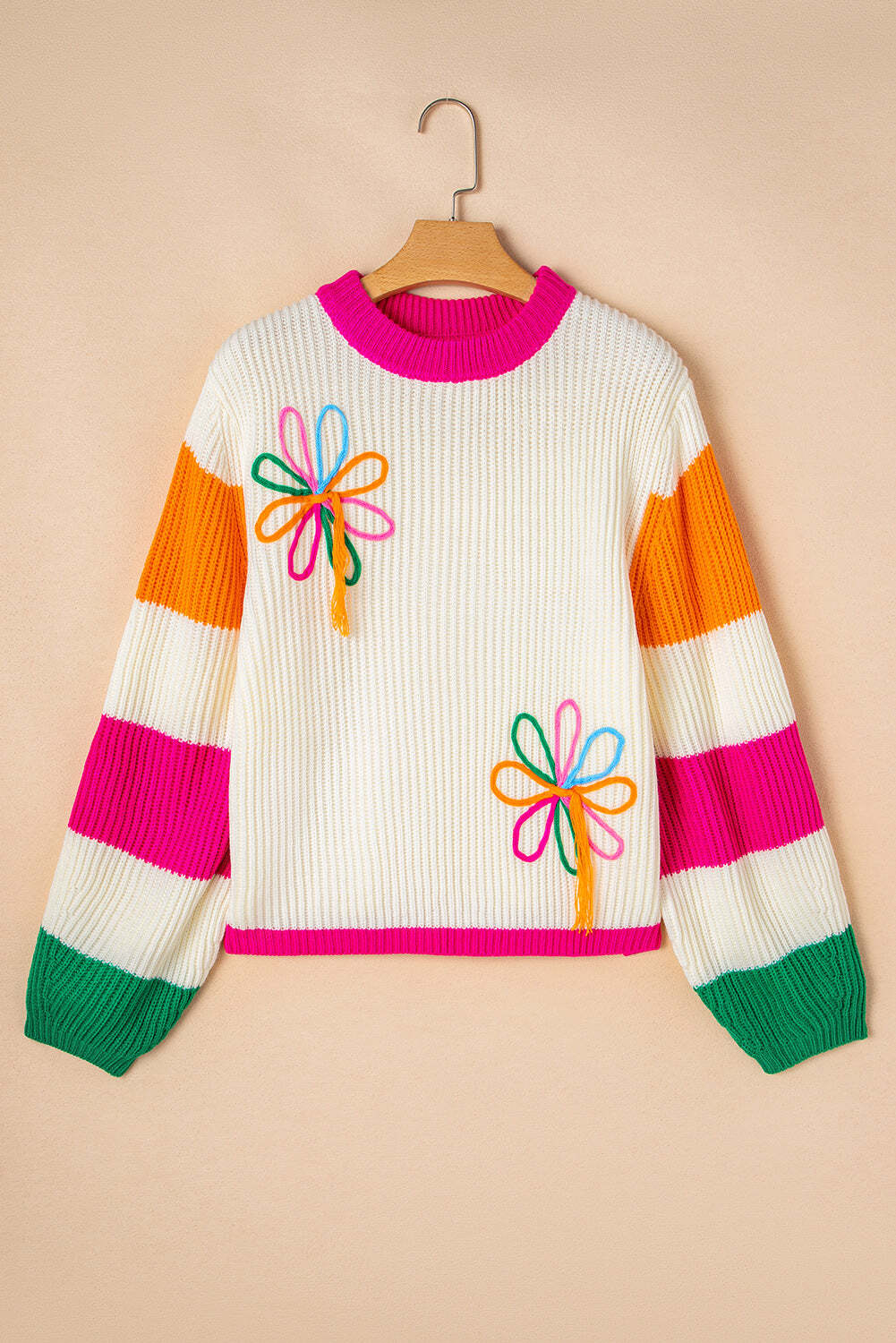 Beige Colorblock Flower Print Cable Knit Loose Sweater